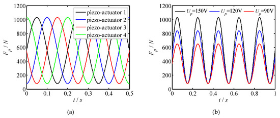 (1) The forces acting on the piezoelectric actuator vary sinusoidal with time. The phase difference of the force curve for each piezoelectric actuator is π/2. Besides, when the peak voltage of each piezoelectric actuator is the same, the maximum output force of each piezoelectric actuator is the same as well.