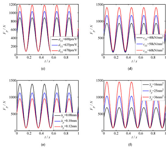 Output forces of the piezoelectric actuator. (a) Force changes with different piezo-actuator; (b) force changes with Up; (c) force changes with d33; (d) force changes with c33; (e) force changes with hp; (f) force changes with Sp.