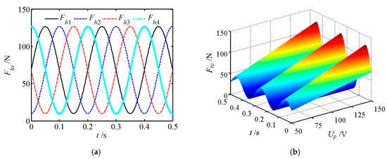 According to Equation (11), the harmonic force of the wave generator has been deduced. Using MATLAB simulation software, the harmonic force under different input signals and its variation with voltage and time are studied as shown in Figure 9. From Figure 9, it can be observed that: