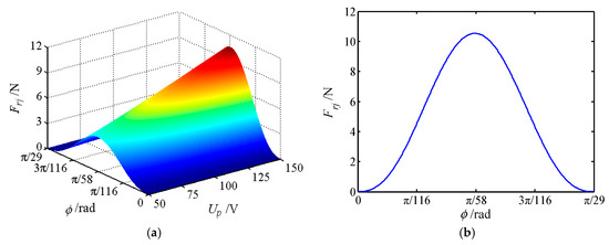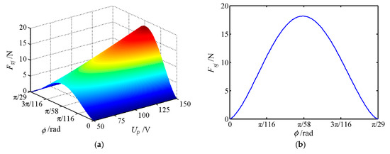 The force of movable tooth Fsj. (a) The force varies with rotational angle and voltage; (b) force sectional view at Up = 150 V.