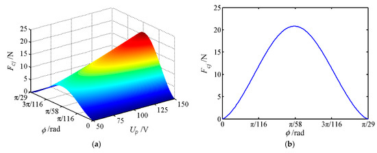 The force of movable tooth Fcj. (a) The force varies with rotational angle and voltage; (b) force sectional view at Up = 150 V.