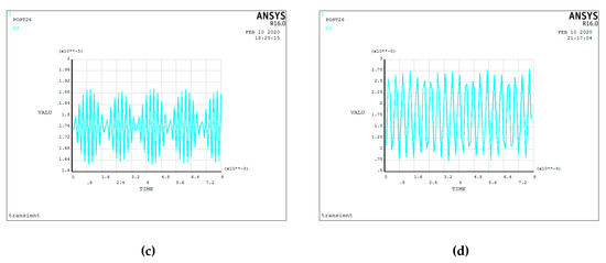 Figure 19 shows the FEA results of the piezoelectric actuator. Its Figure 19a,b give voltage load that applied on the piezoelectric actuator and deformation displacement of the piezoelectric actuator, where a 150 V voltage is applied on it. Figure 19c,d present transient responses at 1000 and 5713 Hz (natural frequency of piezoelectric actuator) of exciting frequency. Figure 20 shows stress analysis results at different times, where a half period time (T/2 in Figure 2) of the exciting signal is selected to illustrate the stress of the displacement magnifying mechanism in different operating conditions. Figure 21 shows the modal analysis results of the piezoelectric focusing mechanism. From Figure 19, Figure 20 and Figure 21, it is known that: