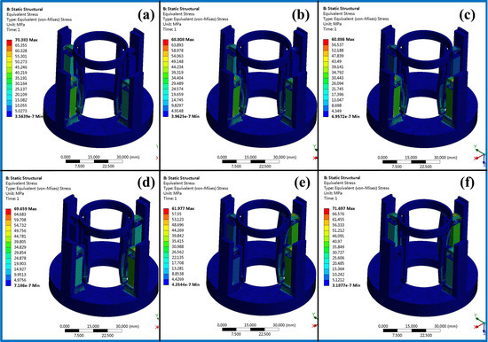 Stress analysis results at different times. (a) At t = 0 s; (b) at t = 0.01 s; (c) at t = 0.025 s; (d) at t = 0.05 s; (e) at t = 0.075 s; (f) at t = 0.1 s.