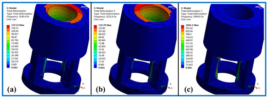 Modal analysis results of the piezoelectric focusing mechanism. (a) First-order mode; (b) second-order mode; (c) third-order mode.