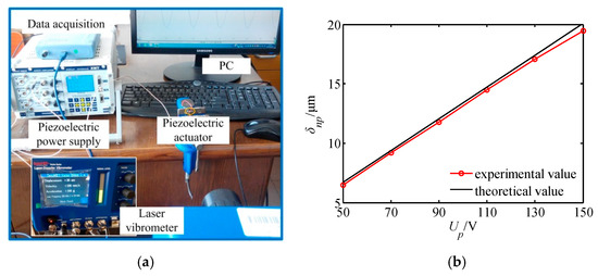 In order to verify the characteristics of the piezoelectric output, the output displacement of the piezoelectric actuator was tested. Figure 22 shows the output displacement test of the piezoelectric actuator, where the XMT piezoelectric power supply is used as the driving signal and power amplifier, and the OptoMET laser vibrometer is applied to test the displacement of the piezoelectric actuator. From the test results in Figure 22b, it is known that: