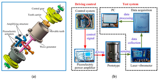 At the same time, in order to verify the feasibility of the design scheme in this paper, the first generation prototype is used to carry out the principium experiment. For the first generation principium prototype, its design principle is the same as that shown in Figure 1. The difference is that the first prototype is driven by two piezoelectric actuators and can only output rotational motion, without a screw drive. The exploded view of the principium prototype and test scheme for the principium experiment are shown in Figure 23, where the control system can output two sinusoidal signals with different phases and positive bias. Table 2 presents the output rotational speed of the principium prototype with different driving voltages. The test results show: