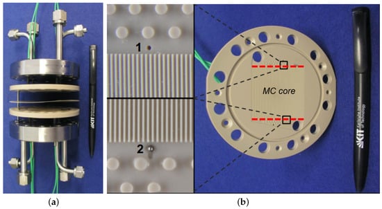 Experimental assembly for double layer Micro heat exchangers (Hx) (taken from []) (a), and zoomed view of single layer (b).