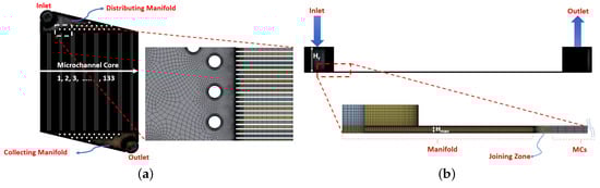 The presence of manifolds introduces flow maldistribution that affects both pressure drop as well as heat exchanger effectiveness of a Hx compared to earlier performed CHT analysis. A single layer of the Hx as shown in Figure 3 is considered in the porous model. This is due to the fact that pressure and temperature drops of hot side from CHT analyses that are used to extract porous medium coefficients and source term, respectively, already catered for any conjugate heat transfer effects of both layers. Therefore, modeling only one layer with these coefficients and source term should be sufficient to emulate a double layer Hx. It is important to emphasize at this point that simulating only one layer essentially assumes that the thermal performance evaluated from both hot and cold layers of the Hx will be the same, which does not hold valid for an unbalanced (different mass flow rates on the hot and cold sides) Hx. Therefore, for every change in the geometry of the microchannel and/or unbalanced flow conditions, new coefficients (see Figure 7) are to be attained. Moreover, as porous media coefficients as well as the source term are mass flow rate dependent, based upon encountered maldistribution in the manifold, each MC will exhibit respective pressure and temperature drop along the length. Therefore, contrary to the conventional isotropic porous medium approach to model the MC core as in [,,,,], the current porous model behaves as an anisotropic porous medium. This essentially means that each microchannel will exhibit different pressure and temperature drop that enables the observation of the extent of the flow maldistribution.