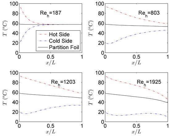 This is simply because gas flow accelerates at the expense of kinetic energy, therefore a part of total energy is utilized for acceleration. Therefore for gas to gas Hxs, it is not recommended to operate in high mass flow regimes because at higher mass flows, gas flows experience a “self cooling” phenomenon at the expense of higher pressure drop. This phenomenon is evident in Figure 6 which shows the evolution of the temperature at the centerline of both fluid streams and partition foil (solid) along the direction of the flow. For smaller mass flows () temperature profiles of hot and cold streams follow the typical trend for incompressible fluids under cocurrent configuration where the temperature of hot and cold fluids is symmetric and partition foil assumes an average constant temperature of the two sides. As fluid velocities increase at the inlets of respective streams, profile symmetry deteriorates with partition foil assuming a temperature that is more influenced by the hot side than the cold fluid side. The outlet temperature of the hot fluid keeps on decreasing with an increased mass flow rate signaling a better heat transfer process. On the contrary, if one is to look at the outlet temperature of the cold fluid a significant decrease is observed by increasing the mass flow rate. This signifies that the cold fluid stream is utilizing the transferred thermal energy from the hot stream, only to increase the velocity (kinetic energy) [,,,].