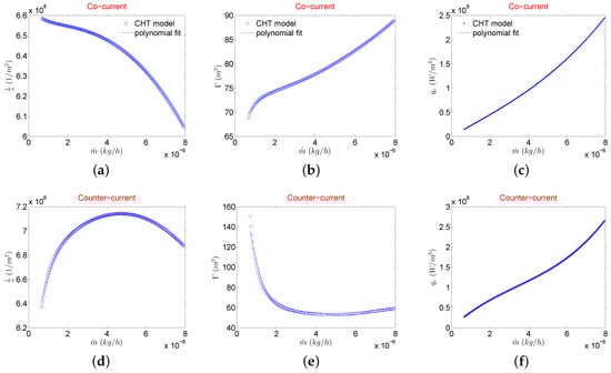 Further step is to evaluate the inertial and viscous coefficients of the modified Darcy’s law using flow quantities evaluated in CHT analysis. For this reason, flow characteristics are extracted at various planes along the length of the hot and cold fluid MCs. These are used to form a set of linear systems of equations to solve for porous medium coefficients utilizing the methodology outlined in Section 1. The solutions of these systems of equations for various mass flow rates results in data points where a polynomial with mass flow rate as dependent variable can be fit to be given as input to the porous medium model available in ANSYS CFX®. In theory, for the range of inlet gas temperatures considered in this study pressure drop from hot side and cold side should be almost similar and furthermore it should be independent of the flow configuration. Therefore any side of the fluid stream (hot or cold) from CHT analysis can be used to evaluate porous medium coefficients. For the scope of this work, hot fluid side is used to evaluate porous medium coefficients. Resulting viscous and inertial coefficients are shown in Figure 7a,b,d,e for both cocurrent and counterflow configurations.