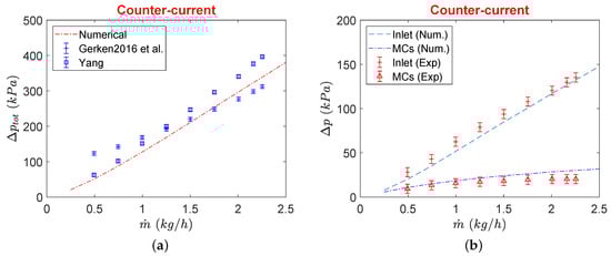 The experimental pressure drop of the double layer Hx being considered in this study for different flow configurations has been reported by Gerken et al. []. Pressure drop showed dependence on the flow configuration as well as the material and thickness of the partition foil employed during the experimental tests. A possible reason for this deviation between different foil materials and thicknesses was associated with possible bending of the thin partition foils inside manifolds although a strong layer of circular pillars was realized underneath (in manifolds) to protect against such undesired deflection of partition foil. Computational results of pressure drop from the current porous model are compared with the experimental results reported for the same Hx from two different studies [,] in Figure 8. As results differ from one separation foil material to the other, only results with stainless steel foil with a thickness of m (as utilized in the current study) are compared and are shown in Figure 8a.