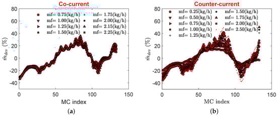 Flow maldistribution is shown in Figure 9 for both cocurrent and counterflow configurations where MC indexing is done as outlined in Figure 3a. As expected, maldistribution shows a weak dependence on the flow configuration where except for the furthest MCs from the inlet, it shows similar patterns in both flow configurations. However, due to the presence of circular pillars, maldistribution does not exhibit a typical profile to be expected of triangular manifolds [,]. Another reason for this could be the orthogonal direction of the inlet with reference to the channel flow whereas in most experimental as well as numerical studies, an inline flow is encountered where fluid enters parallel to the base plane of distributing manifold.