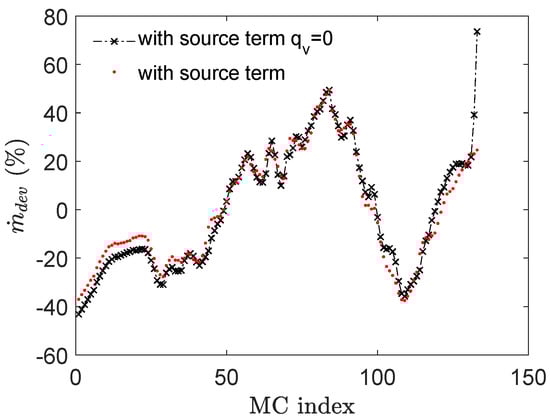 where subscript ‘p’ denotes the porous model. and denote the mass flow weighted averages of static temperatures, at the inlet and outlet of N number of MCs, respectively. The parameter to quantify mass flow maldistribution from the Porous model is defined as: