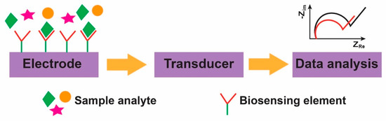 Electrochemical biosensors provide a convenient tool for quantifying the analyte due to its direct conversion of a chemical reaction into an electrical signal. There are several classifications of electrochemical sensing such as Faradaic current-based sensing (amperometric/voltammetric), potential or charge accumulation-based sensing (potentiometric), or electrical conductivity-based sensing (conductometric). Electrochemical impedance spectroscopy (EIS), or impedimetric sensing, is also a commonly used technique where a biological or chemical event causes a change in the impedance (both resistance and reactance) at the liquid–electrode interface [38].