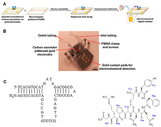 Aptamer-based amperometric microfluidic biosensor: (A) schematic of fabrication process of aptamer-based microfluidic biosensors; (B) a photo of the integrated microfluidic device; and (C) chemical structures of aptamer (left) and vasopressin (right). Reprinted from [40], Copyright 2013, with permission from Elsevier.