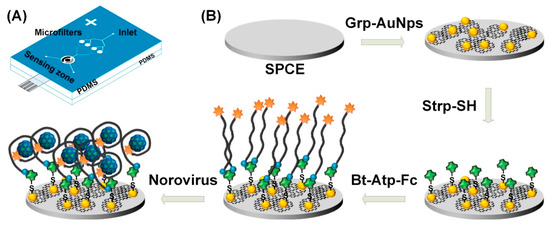 Microfluidic voltammetric aptamer-based detection of norovirus: Schematic of (A) the PDMS microfluidic chip; and (B) the processing steps to fabricate the biosensor. Grp-AuNPs: graphene-gold nanoparticles composite, Strp-SH: thiolated streptavidin, Bt-Atp-Fc: biotin and ferrocene tagged aptamer. Reprinted from [43], Copyright 2017, with permission from Elsevier.