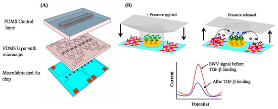 Electrode fouling [45] often becomes a serious issue for electrochemical detection. To solve this problem, Matharu et al. have developed a reconfigurable microfluidics platform that uses aptasensors to electrochemically monitor the dynamics of the transforming growth factor TGF-β1 released by activated hepatic stellate cells over 20 hours [46]. This three-layer microfluidic device comprises a microfabricated gold electrode on glass slide, a microfluidic channel with microcups and a PDMS control layer (Figure 4). When the microcups were lowered by pneumatically actuating the control layer, the electrodes were protected during the protein adsorption and cell seeding steps. This reduced the non-specific adsorption of highly adhesive stellate cells, thus preventing electrode fouling. This work reported a 15-fold improvement in the sensitivity compared to traditional approached with unprotected electrodes. After seeding and activation of the stellate cells, square wave voltammetry (SWV) was applied to measure the electron transfer which resulted in a detection limit of 1 ng/mL.