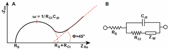 An impedimetric transduction mechanism is a label-free mechanism that works on the basis of EIS. EIS can analyze both the resistive and capacitive properties of the electrode surface upon excitation and perturbation of the system at equilibrium with a small amplitude sinusoidal excitation signal [47]. The resulting spectrum (Figure 5A), known as the Nyquist plot, can be modeled by the Randles circuit as seen in Figure 5B. This Randles circuit is a valuable technique for the characterization, analysis and study of coatings, batteries, fuel cells and corrosion phenomena [47]. This circuit consists of a solution resistance (RS), a double-layer capacitance (Cdl), a charge transfer resistance (Rct), and the Warburg impedance (ZW).