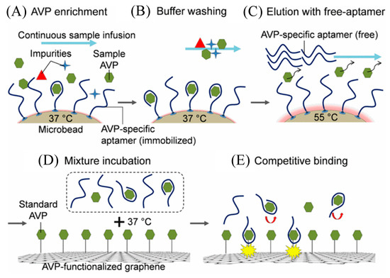 Schematics showing the working principle of the arginine vasopressin (AVP) detection. The sample AVP is enriched on microbead surfaces by aptamer binding (A) and then is washed with a buffer (B) followed by an increase in temperature to 55 °C that disrupts the aptamer-AVP complexes and release sample AVP into a free aptamer solution (C). The mixture of the free aptamers and the released sample AVP is incubated with graphene functionalized with standard AVP (D), that induces binding of free aptamer to the standard AVP on graphene via the competitive binding process (E) and thus changing the conductance of the graphene channel. Reprinted from [67], Copyright 2015, with permission from The 28th IEEE International Conference on Micro Electro Mechanical Systems (MEMS).