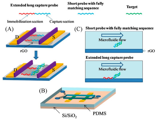 Mechanism of extended long-capture probe immobilization strategy to keep probe stability in the flow environment: (A) The immobilization section of extended long capture probe still keeps stacking interaction on the reduced graphene oxide (rGO) surface after hybridization; (B) The PDMS microfluidic integrated rGO transistor chip; (C) In flowing environment, short capture probes with fully match sequence after hybridization with target are washed away from rGO surface. Extended long capture probes are still kept on rGO surface. Reprinted from [69], Copyright 2017, with permission from Elsevier.