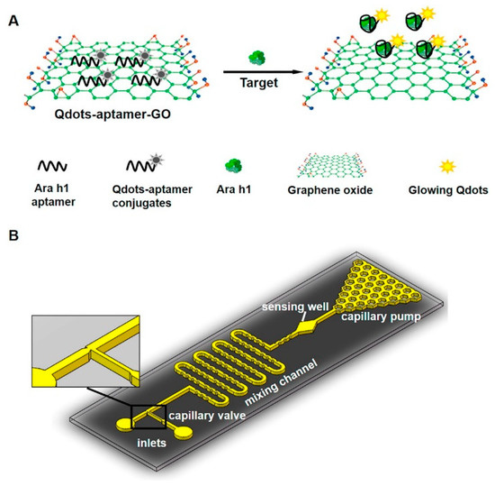 Microfluidic fluorescence biosensor: Schematic diagram of the (A) sensing mechanism of the quantum dots (QDs)-aptamer-graphene oxide (GO) quenching system; and (B) microfluidic chip which has two inlets for loading the QDs-aptamer-GO probe mixture and the Ara h 1 sample, respectively. Reprinted from [74], Copyright 2016, with permission from Elsevier.