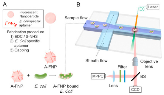 Schematics of the aptamer-based optofluidic detection system: (A) preparation of aptamer conjugated fluorescence nanoparticles (A-FNPs); and (B) detection of A-FNP-bound E. Coli by the microchannel and optical particle counter. Reprinted from [81], Copyright 2015, with permission from Elsevier.