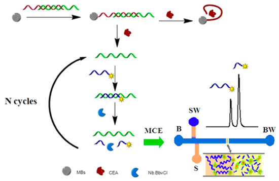 Schematic illustration of detection principle with the proposed aptamer-based microfluidic capillary electrophoresis (MCE) assay for amplification detection of carcinoembryonic antigen (CEA). Abbreviations: S, sample reservoir; SW, sample waste reservoir; B, buffer reservoir; BW, buffer waste reservoir; MBs, magnetic beads. Reprinted from [85], Copyright 2015, with permission from Elsevier.