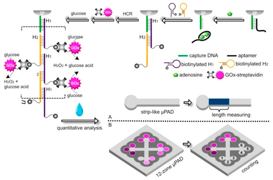 Schematic diagram illustrating the naked-eye quantitative aptamer-based assay for the detection of adenosine as a model analyte based on (A) the length measurement of the colored region in a strip-like microfluidic paper-based analytical device (μPAD) or (B) the counting of the colorless microzones in a wax-pattered 12-zone μPAD. Reprinted from [90], Copyright 2016, with permission from Elsevier.