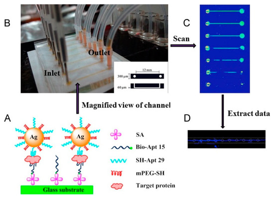 Colorimetric detection using silver nanoparticles aptasensor: (A) schematic illustration of capturing target proteins and colorimetric detection based on aptamer-AgNPs in the microfluidic chip; (B) photograph of the microfluidic device consisting of 7 channels for thrombin capture and colorimetric detection; (C) scanned picture of microfluidic chip after reaction; and (D) gray scale values were acquired on each channel. Reprinted from [89], Copyright 2016, with permission from Elsevier.