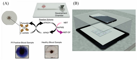 A colorimetric biosensor for telemedicine application has been developed by Fraser et al. [96] who have integrated an aptamer-tethered enzyme capture (APTEC) technique on a microfluidic device for magnet-guided capture, wash, and detection of the biomarker. Three separate microfluidic chambers were designed to implement the magnet-guided colorimetric detection of the PfLDH protein. In the first chamber (incubation chamber), aptamer-coated micromagnetic beads (μMBs) were bound specifically to their target by incubation in a lysed sample of human blood. Next, a washing step was conducted in the second chamber to remove any unbound molecules and other contaminants. This was followed by the transfer of the aptamer-μMB-target complex to the third chamber containing the development reagent that generated a strong colorimetric signal in the presence of PfLDH. (Figure 15A). The signal analysis was conducted by placing the device on top of a tablet device (Figure 15B) displaying a homogeneous background in a concealed box. Images were captured using a smartphone camera and coupled with metadata containing time, date, and GPS coordinates for the telemedicine application. At the receiver side, the images were analyzed with ImageJ software.