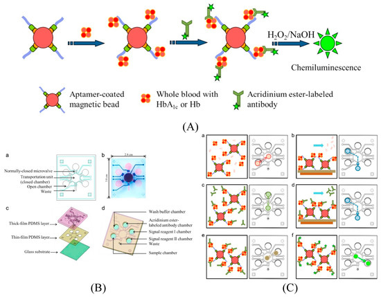 Chemiluminescent aptamer-based microfluidic biosensor: schematic illustration of the (A) working principle; (B) (a–d) microfluidic chip composed of micro-components; and (C) experimental procedure performed on the integrated microfluidic chip. (a) magnetic beads pre-coated with Hb or HbA1c aptamers were transported to the transportation unit (the close chamber) and incubated with blood samples; (b) target-aptamer-bead complexes were collected by applying an external magnetic field while washing the supernatant and non-binding substances with phosphate-buffered saline (PBS); (c) the acridinium ester-labeled Hb or HbA1c specific antibodies were transported to the transported to the transported unit and reacted with Hb or HbA1c; (d) the sandwich-like structures with target-aptamer-bead complexes were collected while washing the supernatant and non-binding substances with PBS buffer; (e) H2O2 was transported to the transportation unit to re-suspend the magnetic beads; and (f) the target-aptamer-bead complex with the acridinium was transported to the NaOH chamber and the chemiluminescent signals were detected with a luminometer. Reprinted from [99], Copyright 2015, with permission from Elsevier.