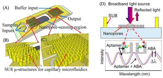 Song et al. have reported an optical interferometric aptamer-based biosensor for sensitive and specific detection of plant hormone abscisic acid (ABA) on a microfluidic device [104]. As can be seen in Figure 17, the microfluidic chip consists of a nanopore-based sensing region and SU-8 microstructures as capillary microfluidics on both sides of the sensing region consisting of periodically distributed nanopores. These nanopores are used to generate the optical interference fringes that work as the transducing signal for the biosensor. Upon delivering the samples to the chip, the capillary force generated from the SU-8 nanostructures automatically transport the samples to the nanopore sensing region. Upon specific binding between the ABA and the aptamer, a phase shift in the transducing signal occurs. Not only did this sensing strategy offered exceptional sensitivity in ABA detection, it also enabled the automation of the total sensing process without any external pumps.