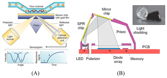 Principle of surface plasmon resonance (SPR) biosensor: (A) schematic of a SPR-based detection method. Reprinted from [107], Copyright 2002, with permission from Springer Nature; and (B) cross-sectional view of the Sensata Spreeta SPR sensor. Inset shows the photograph of the actual device. Reprinted from [108], Copyright 2003, with permission from Elsevier.