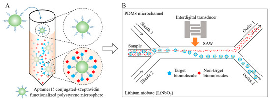 - Ahmad, R.; Destgeer, G.; Afzal, M.; Park, J.; Ahmed, H.; Jung, J.H.; Park, K.; Yoon, T.-S.; Sung, H.J. Acoustic Wave-Driven Functionalized Particles for Aptamer-Based Target Biomolecule Separation. Anal. Chem. 2017, 89, 13313–13319. [Google Scholar] [CrossRef] [PubMed]