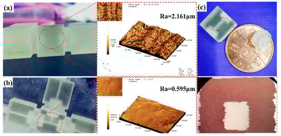 Micrographs of the chip surface quality. (a) surface quality and surface roughness before treatment. (b) surface quality and surface roughness after polishing and polydimethylsiloxane (PDMS) treatment coating. (c) image of 3D printed module components.
