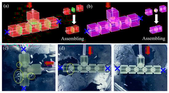 The assembly modules were carefully selected from well-known standard component as shown in Figure 1a,b. The assembly modules, which were designed to a standard, cubic geometric footprint (with a size of 10 by 10 by 10 mm3), comprised functional elements (assembly module) as well as inlet/outlet modules (screw fastener) for world-to-chip fluidic interconnects. The internal channels of these module were designed into a square cross-section with 0.6 mm side length. Each module had different functionality, which acts as basic building units to construct functional microfluidic device. A multi-function microfluidic system was assembled form several modular components (Figure 1c). The screw fastener acted as module-to-module or world-to-chip fluidic interconnects. The spacers were cylindrical with screw pins at opposite sides. The modules were assembled by interlocking screw pins connectors for each module. Following the 3D printing process, the modules were placed in the convection oven at 80 °C to remove the wax layers. When the wax was fully melted, its residue was first removed in a hot oil bath and was then rinsed by ultrasonication in a water bath that contained detergent. The modules were then further rinsed by ultrasonication in a deionized water bath to ensure that the detergent remains were fully removed, and that each procedure was conducted for at least 30 min.