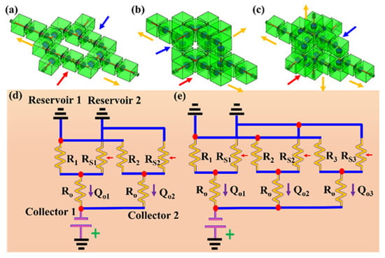 The tunable mixer with (a) two, (b) three, and (c) four outlets. (d,e) comparison of equivalent circuit models for two- and three-outlet parallelized configurations of the tunable mixer system.