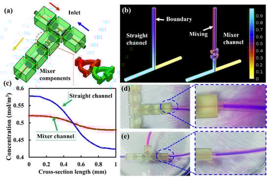 (a) schematic illustration of microfluidic system assembly with mixed channel module. (b) simulation of mixing effects for straight channel and mixer channel modules. (c) normalized concentration of the outlet for the straight channel and mixer channel modules, respectively (the terminal of the microchannel). (d,e) mixing effects of fluids in straight channel and mixer channel modules.