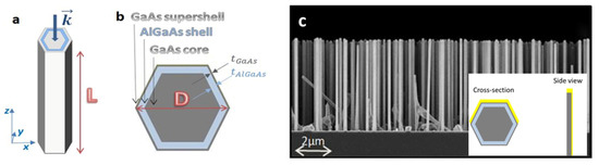 The structures under examination are nanowires of GaAs with a hexagonal cross section. They have a core of GaAs surrounded by a thin shell of AlGaAs to passivate the GaAs surface, around which there is a thin supershell of GaAs in order to prevent the oxidation of Al, as described in the scheme in Figure 1a. The geometric parameters of the four samples that were fabricated are depicted in Table 1 (the NW length L, the overall diameter D, AlGaAs shell thickness tAlGaAs, and GaAs supershell thickness tGaAs).