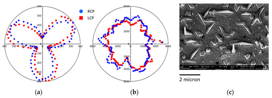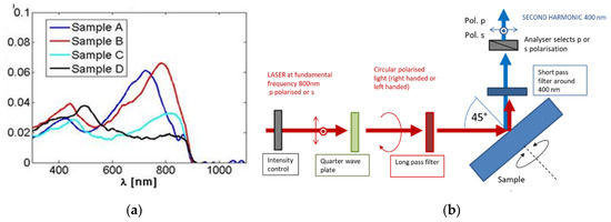 By breaking the symmetry of the nanostructure–light interaction, it is possible to observe a circular dichroism (CD) due to the so-called extrinsic chirality or pseudo chirality [6,7,8]. Chirality is the lack of mirror symmetry [9], and can be probed using photoacoustic techniques that are sensitive to the differential absorptions of opposite-handed light [10,11,12] or by techniques sensitive to symmetry breaking such as second harmonic generation–circular dichroism (SHG-CD) [13,14]. In the case of extrinsic chirality, the high sensitivity of SHG is related to the fact that SHG can only occur in systems with broken inversion symmetry, enabling background-free measurements and leading to higher CD responses with respect other measurement systems [15]. The chiroptical responses of nanostructures have recently generated interest because most biomolecules are chiral, and their enantiomeric discrimination is relevant to industries such as pharmacology, agrochemicals and biotechnology, as well as for circularly polarized light emissions for communication and quantum optics applications [16,17]. Moreover, organic chiral molecules are used in field-effect transistor devices to detect or enhance the detection of circularly polarized light [18,19], while chiral oligothiophene thin films have shown interesting chiroptical properties that are useful to optoelectronic devices for imaging [20,21]. Thus, there is an evident need for a deep study of chiroptical effects at a nanoscale.