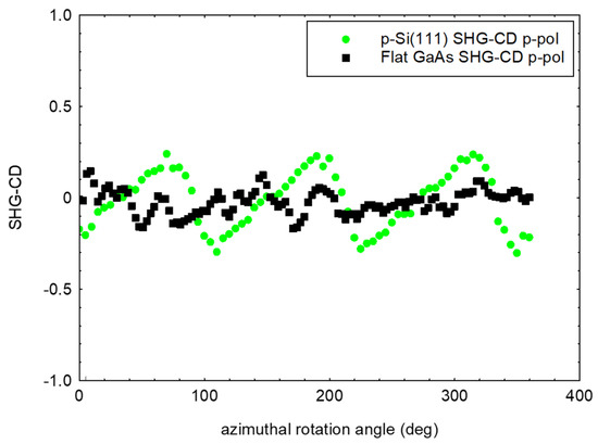 In the case of Si(111), the SHG-CD was regular even when it was lower than 0.2, while in the case of GaAs it was randomly distributed at values lower than 0.1.