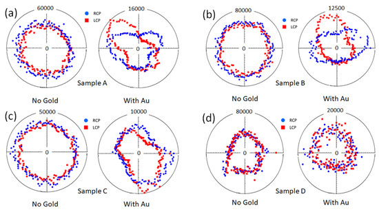 On the left side of each panel of Figure 5, the measured p-polarized SHG signal from Samples A,B,C,D are shown without gold as a function of the azimuthal rotation of each sample for two orthogonal circular polarization states of the laser pump (RCP and LCP), while on the right side of each panel of Figure 5, the measured p-polarized SHG signal of Samples A,B,C,D are shown with asymmetric gold coating. It is evident that the asymmetry in the structures of Samples A,B,C (with Au) led to a strong difference in the SHG signal as a function of the handedness of the circular polarized light, while the SHG response of Sample D with Au was very similar to its uncoated counterpart.