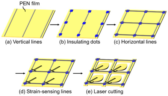Strain-sensing wires were printed, as shown in Figure 1d, to create a strain sensor matrix. Here, we used an original paste that provides a resistive film with high strain sensitivity. As the details of this paste have been reported previously [17], we only provide the outline in this paper. The paste mainly consisted of a mixture of conductive carbon black (#3030B, Mitsubishi Chemical) and polyimide vanish (IRP-1200, Sanwa Chemical) as a binder polymer. The carbon black and the polyimide varnish were mixed using an automatic hoover muller (Toyo Seiki, Seisaku-sho, Ltd., Tokyo, Japan) with a volume ratio of 6:4. The density of the carbon black was lower than that of a typical conductive paste; thus, the change in resistance against any applied strain was larger and easily detectable. The polarity of the resistance change due to a strain was such that the resistance increased as the resistive film physically expanded, similar to a general strain gauge that consists of a metal foil. The strain-sensing wire used in this study had a high gauge factor of over 50. This value was considerably higher than that of commercially available strain gauges, which have gauge factors of approximately 2. Such high sensitivity allows direct detection of changes in resistance, and hence no bridge and amp circuit were required. The resistive film was connected to the vertical and horizontal lines and was shaped as tilting–folding back lines with a width of 0.2 mm, as described in Figure 1d. The paste was thermally cured at 150 °C for 30 min.