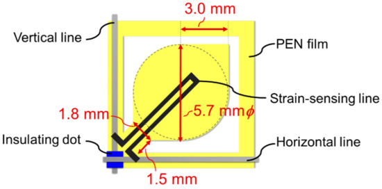 The thicknesses of the vertical and horizontal lines, insulating dots, and strain sensor were measured 7.8, 21.1, 14.1, and 29.5 μm, respectively, by using a microfigure measuring instrument (ET-5000, Kosaka Laboratory, Tokyo, Japan). As these elements were designed using width in the order of submillimeters, defects, such as short circuits and disconnection, could be avoided. In other words, screen printing was confirmed to be a satisfactory method of fabricating submillimeter-order circuits of high quality.