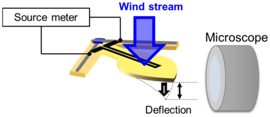 As already mentioned in Section 1, this operation offers specific advantages of evaluating aerodynamic characteristics according to the degree of freedom set during the sensor installation. This method can be applied for evaluating curved surfaces, such as those of automobiles and aircraft. Furthermore, the fabrication process executed in this work is relatively suitable for fabricating large areas. Thus, it can also be applied toward imaging circulating air in living spaces, factories, and closed chambers. We consider that the addition of the mechanical function to the film substrate by using laser cutting to utilize the feature of substrate flexibility is crucial to the design. We strongly believe that this device design concept, which we call flexible mechatronics, will spur more developments in the field of flexible electronics.