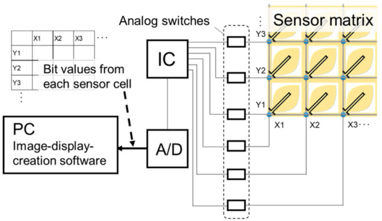 The fabricated sensor matrix was applied to a wind pressure distribution imaging system. The system consisted of an exclusive circuit and image-display-creation software. A schematic of the circuit is shown in Figure 4. Each vertical and horizontal line in the sensor matrix was connected to an IC chip to measure the resistance of each sensor cell. The IC also controlled the analog switches, which were positioned at every pass between the lines and the IC, to determine the appropriate position for applying the voltage. The resistance of each cell was sent from the IC to an A/D converter to transform the resistance to a bit value with 256 gradations. Finally, the image-display-creation software in a PC received the bit data, before visualizing the distribution as a color tone based on the bit values and their location in the matrix.