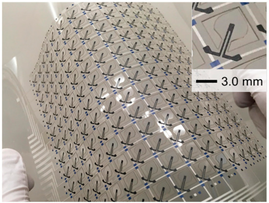 Flexible electronics have attracted increasing attention in recent years. Devices fabricated on thin flexible films can provide attractive features, such as the comfort of portability by rolling up or folding of the devices. Moreover, owing to their flexibility, they can be fixed on curved surfaces. With these prospects, developments pertaining to flexible displays have been energetically pursued from the early stages of flexible electronics [1,2,3,4]. In addition, development of flexible sensors has been rapidly gaining attention. For sensor applications, the convenience of flexible films that can be fixed, such as bandages, is particularly attractive. It has been demonstrated that advancements in the field of flexible sensors can lead to the realization of three-dimensionally curved surfaces capable of detecting physical and chemical phenomena, similar to human skin. Therefore, the development of flexible sensors has been the focus of several research groups, and significant progress has been made in this regard [5,6]. Furthermore, large-area applications, such as wallpapers and carpets, are another feature of flexible sensors. Sensor matrixes with large areas have been demonstrated to detect the distribution of physical quantities, such as pressure [7,8,9]. The industrialization of such large-area sensors requires an improved manufacturing process that can efficiently process the large areas. Thus, printing technology was developed to create functional layers in the atmosphere without the use of photoresists and the etching process [10,11,12].