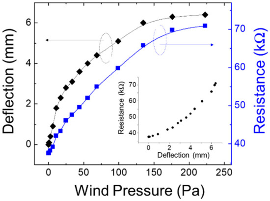 Deflection of the suspended structure and resistance recorded by the single sensor for different wind pressures.