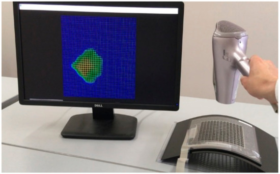 The sensor matrix developed in this work was successfully operated, as shown in Figure 7. A cool wind stream was provided through a hairdryer to the sensor sheet. The wind speed ranged from 4.0–8.0 m/s. The obtained wind pressure distribution was imaged graphically by using the above-mentioned software. The result clearly showed the usefulness of the developed sensor sheet for aerodynamic evaluation, alongside Xu et al.’s recent report, which represents successful monitoring of wind speed and direction [13]. In particular, the proposed device design was specialized for the detection of wind pressure through the mechanical motion of the film. Moreover, the device configuration of the passive matrix enables it to efficiently respond to changes in the area and the points of the sensor sheet.