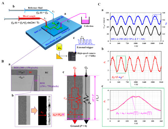 As shown in Figure 1C, as a preliminary study, a blood sample (Hct = 50%) was prepared by adding normal RBCs into 1x PBS. The blood sample was supplied into inlet (a) at a sinusoidal flow rate (QB (t) = 1 + 0.5 sin (2πt/360) mL/h). Simultaneously, 1x PBS was supplied into inlet (b) at a constant flow rate of QR (t) = 1 mL/h. Figure 1C-a showed temporal variations of <UBC> and αB over time. In addition, <UBC> and αB exhibited periodic variations over time. Figure 1C-b showed temporal variations of βB = (1 − αB)−1 over time. Figure 1C-c showed temporal variations of βB selected for a single period (T = 360 s). The expression of βB (t) was assumed to be βB (t) = a0 + a1·cos (ωt) + a2·sin (ωt). Using the orthogonal property of the sinusoidal function (sin (ωt) and cos (ωt)), three unknown constants (a0, a1, and a2) were obtained from Equations (21)–(23).